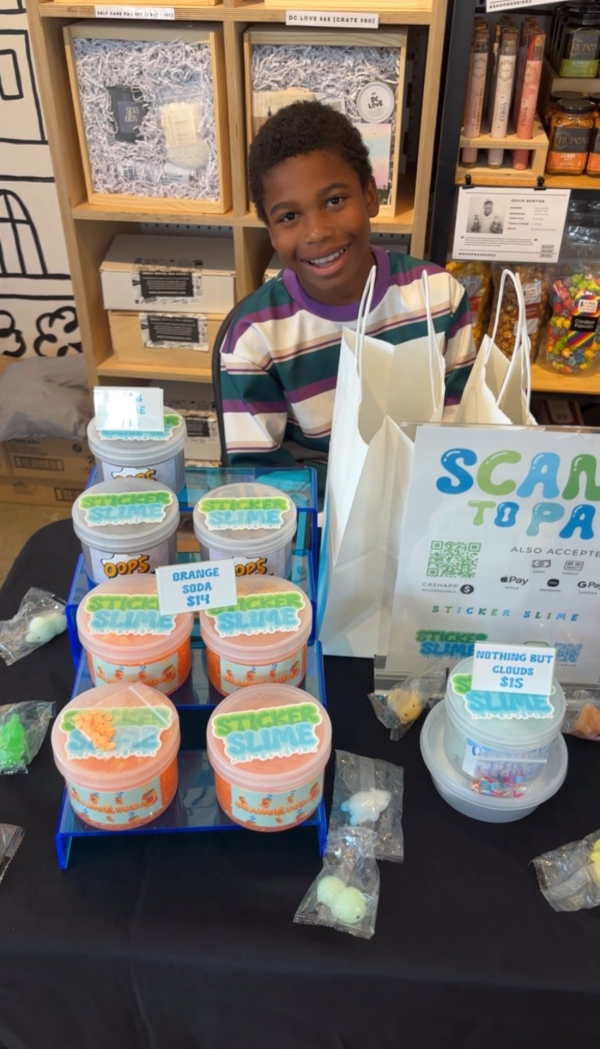 Hi, my name is Eden. I’m ten years old and this is my business! My favorite color is blue and my second favorite is gold. I have lots of family and friends that have supported me and my business. Click below to learn more about StickerSlime.